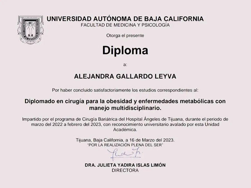 Fellowship of advanced laparoscopic surgery, surgery for obesity and metabolic diseases (March 2022- March 2023) Hospital Ángeles Tijuana - International Federation of the Surgery for Obesity and Metabolic disorders Latin America (IFSO LAC), Mexican College for Surgery of Obesity and Metabolic Diseases (CMCOEM).